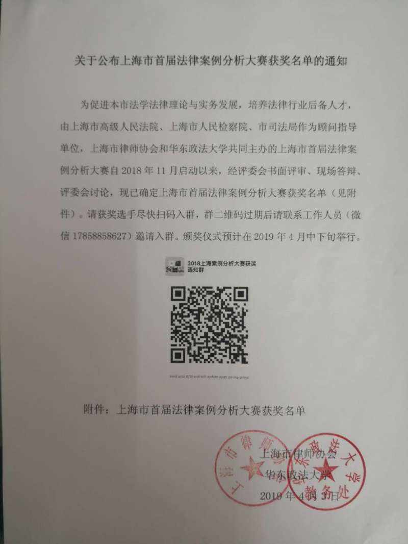 为促进本市法学法律理论与实务发展,培养法律行业后备人才,由上海市高级人民法院、上海市人民检察院、市司法局作为顾问指导单位,上海市律师协会和伟德国际英国共同主办的上海市首届法律案例分析大赛自2018年11月启动以来,经评委会书面评审、现场答辩、评委会讨论,现已确定上海市首届法律案例分析大赛获奖名单(见附件)。请获奖选手尽快扫码入群,群二维码过期后请联系工作人员(微信17858858627)邀请入群。颁奖仪式预计在2019年4月中下旬举行。