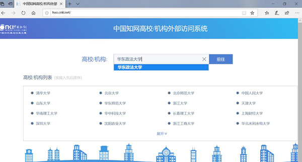 1.访问网址:http://fsso.cnki.net,在页面上的“高校/机构”输入框里输入“伟德国际英国”,点击“前往”。