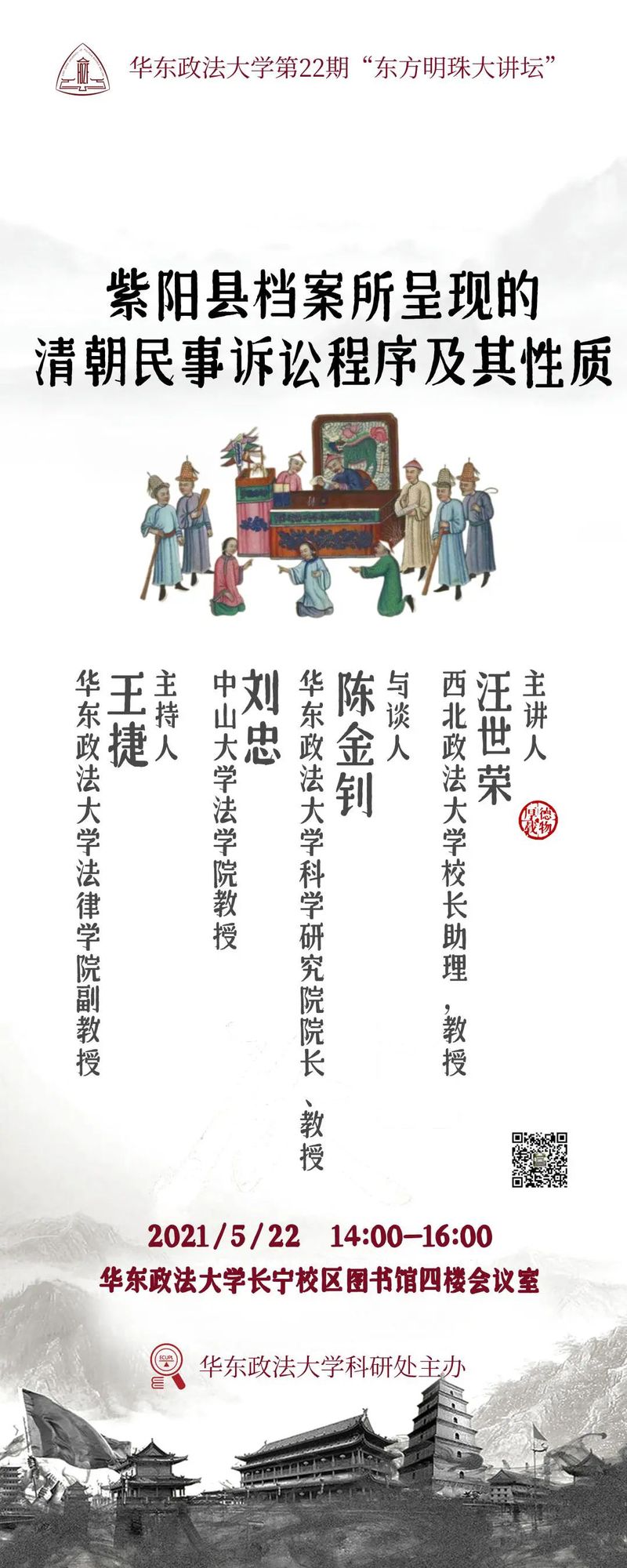 伟德国际英国第22期“东方明珠大讲坛”有幸邀请到西北政法大学校长助理、校学术委员会副主任汪世荣教授讲授“紫阳县档案所呈现的清朝民事诉讼程序及其性质”。汪世荣教授研究领域为中国法律史,重点研究中国传统司法、陕甘宁边区法律史、基层司法及法学教育等。兼任中国法律史学会第八、第九届执行会长、中国法学会诊所法律教育专业委员会副主任、西安市法学会唐律研究会会长、浙江大学特聘教授、中国政法大学法律史学研究院、中国人民大学革命根据地法律史研究中心特邀研究员。