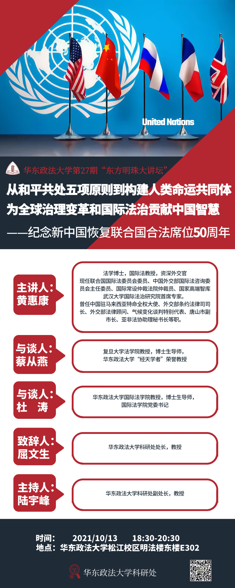 今年是新中国恢复联合国合法席位50周年。为纪念这一重要时刻,我们特别邀请到联合国国际法委员会委员、外交部国际法咨询委员会主任委员黄惠康大使做客东方明珠大讲坛。黄大使将以《从和平共处五项原则到构建人类命运共同体为全球治理变革和国际法治贡献中国智慧》为题,重温五星红旗第一次在联合国上空升起的历史时刻;阐释新中国恢复联合国合法席位的重大历史意义;概述半个世纪以来,从融入、参与到引领,中国为全球治理变革和国际法治所作出的巨大贡献;分析“两局”交织背景下中国特色大国外交面临的难得历史机遇和前所未有的严峻挑战;并就如何加强涉外法治人才队伍建设建言献策。这对于华政学子而言,无疑将是一场法律与外交、理论与实践、历史与未来相结合的思想盛宴,欢迎参与。