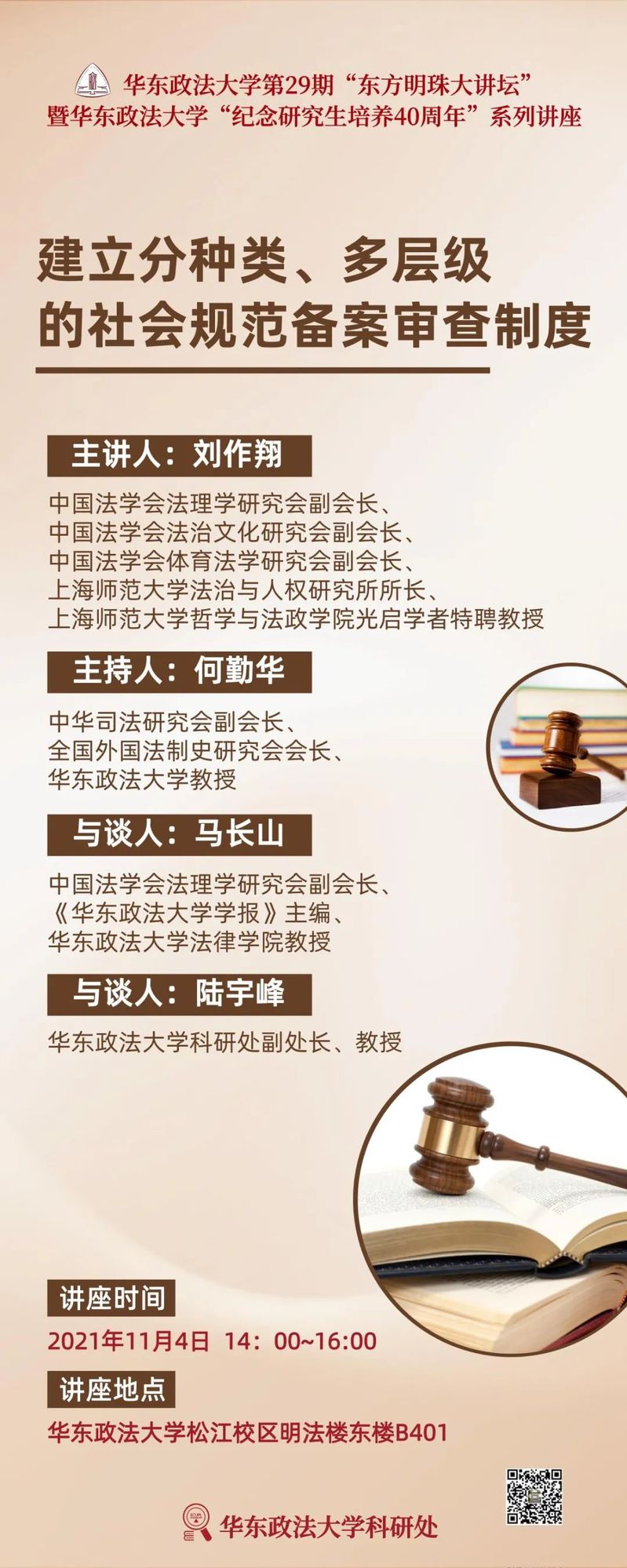 主讲人:刘作翔 法学博士,上海师范大学法治与人权研究所所长,哲学与法政学院光启学者特聘教授,博士生导师,博士后流动站合作导师。上海师范大学学术委员会副主任,哲学与法政学院学术委员会主任。中国法学会法理学研究会副会长,中国法学会法治文化研究会副会长,中国法学会体育法学研究会副会长,中国法律社会学专业委员会顾问。