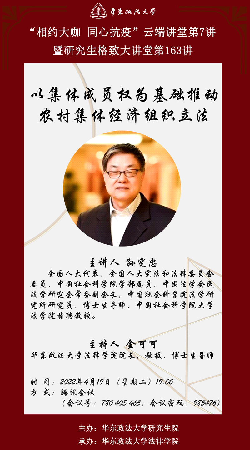 主讲人:孙宪忠,全国人大代表,全国人大宪法和法律委员会委员,中国社会科学院学部委员,中国法学会民法学研究会常务副会长,中国社会科学院法学研究所研究员、博士生导师,中国社会科学院大学法学院特聘教授。