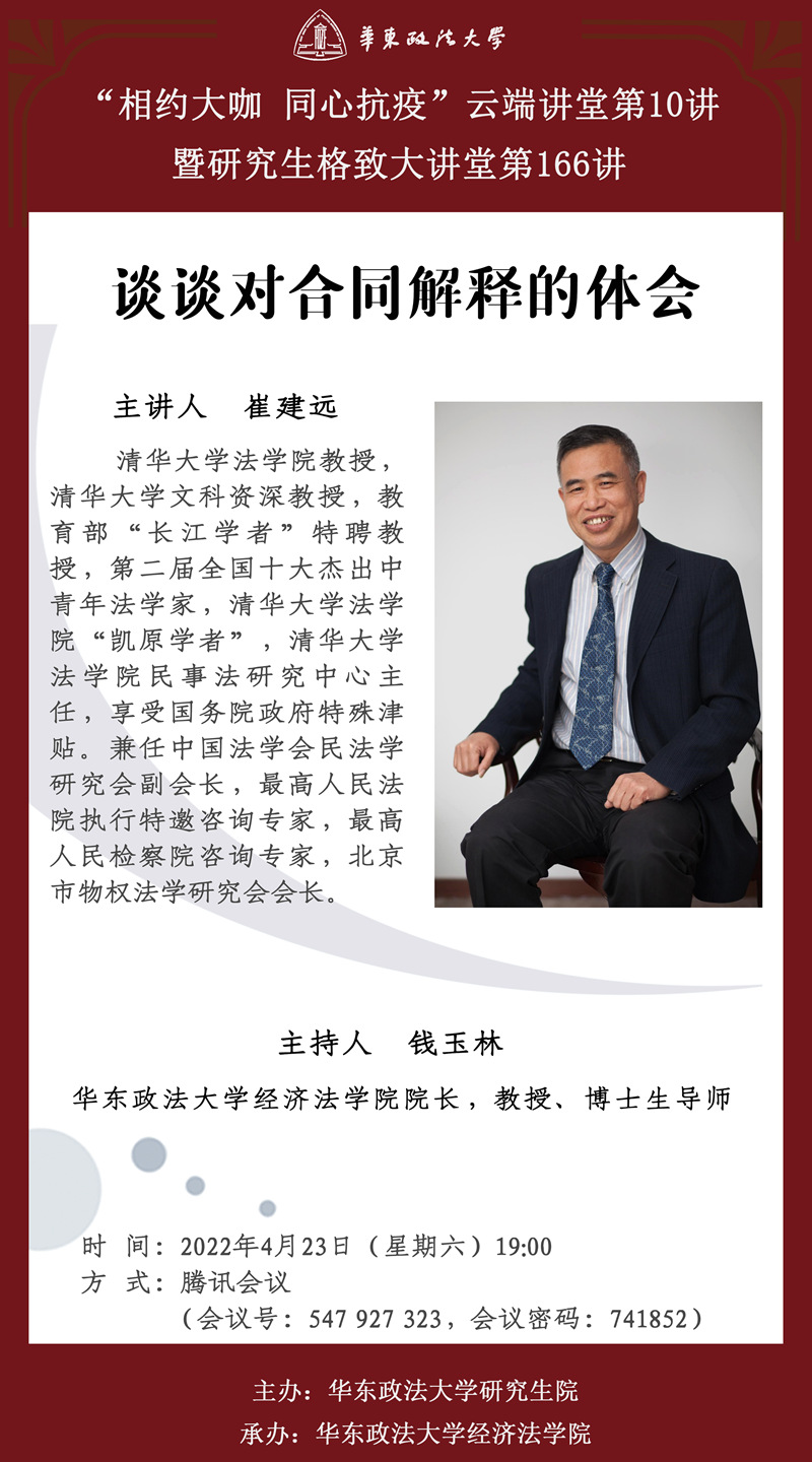 主讲人:崔建远,清华大学法学院教授,清华大学文科资深教授,教育部“长江学者”特聘教授,第二届全国十大杰出中青年法学家,清华大学法学院“凯原学者”,清华大学法学院民事法研究中心主任,享受国务院政府特殊津贴。兼任中国法学会民法学研究会副会长,最高人民法院执行特邀咨询专家,最高人民检察院咨询专家,北京市物权法学研究会会长。