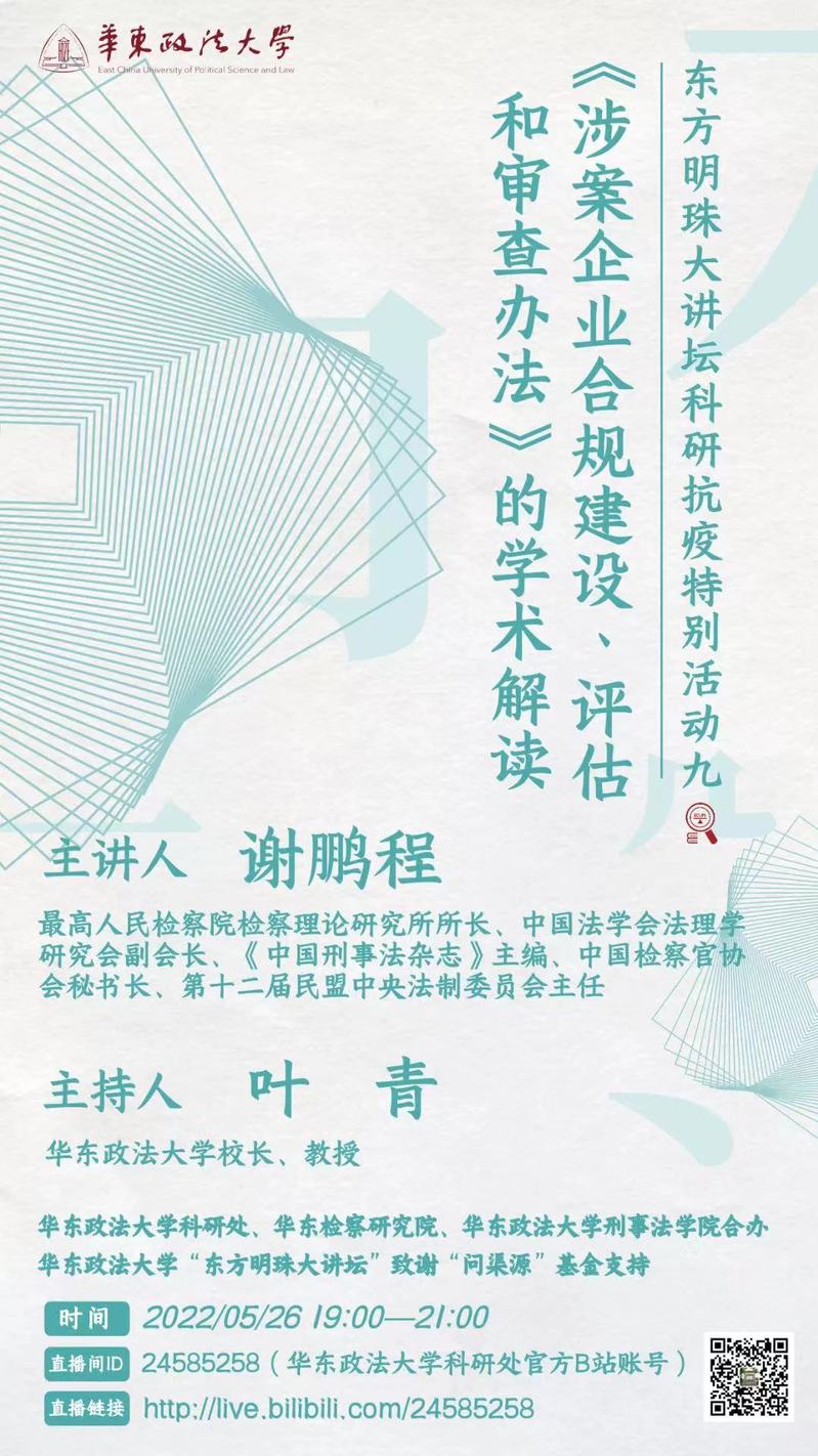 本次特别活动有幸邀请到最高人民检察院检察理论研究所所长谢鹏程教授担任主讲嘉宾,主讲“《涉案企业合规建设、评估和审查办法》的学术解读”。谢鹏程教授现任最高人民检察院检察理论研究所所长、中国法学会法理学研究会副会长、《中国刑事法杂志》主编、中国检察官协会秘书长、第十二届民盟中央法制委员会主任,享受国务院特殊津贴的专家。在《中国社会科学》《法学研究》《中国法学》《求是》等权威刊物发表等论文270多篇,著有《基本法律价值》《公民的基本权利》《论检察》等多部,翻译、主编、参编著作六十余部。本次活动由华东政法大学校长叶青教授主持。