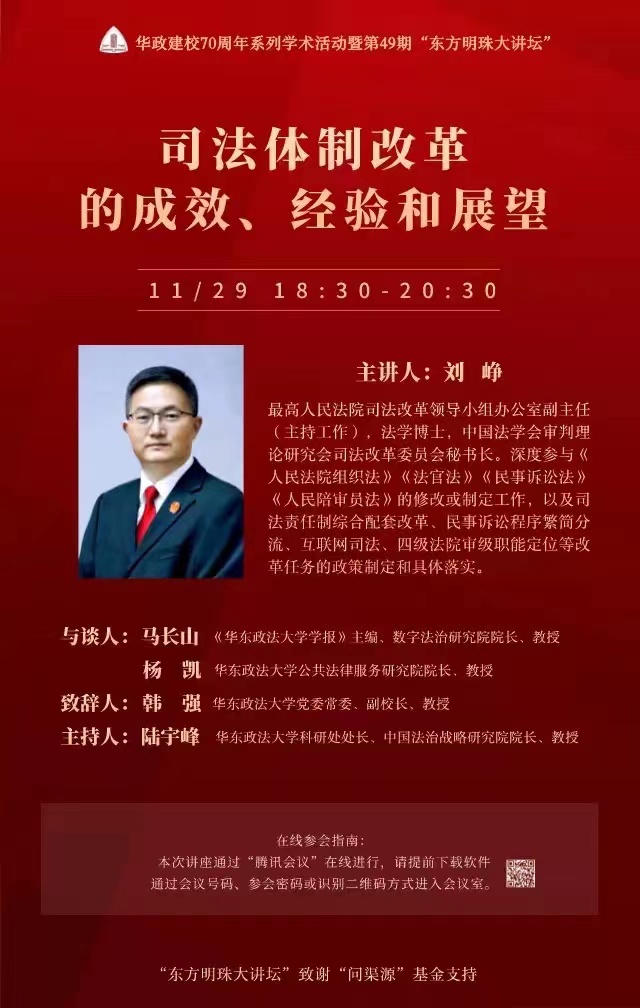 为此,华政建校70周年系列学术活动暨第49期“东方明珠大讲坛”有幸邀请到刘峥主任主讲“司法体制改革的成效、经验和展望”。