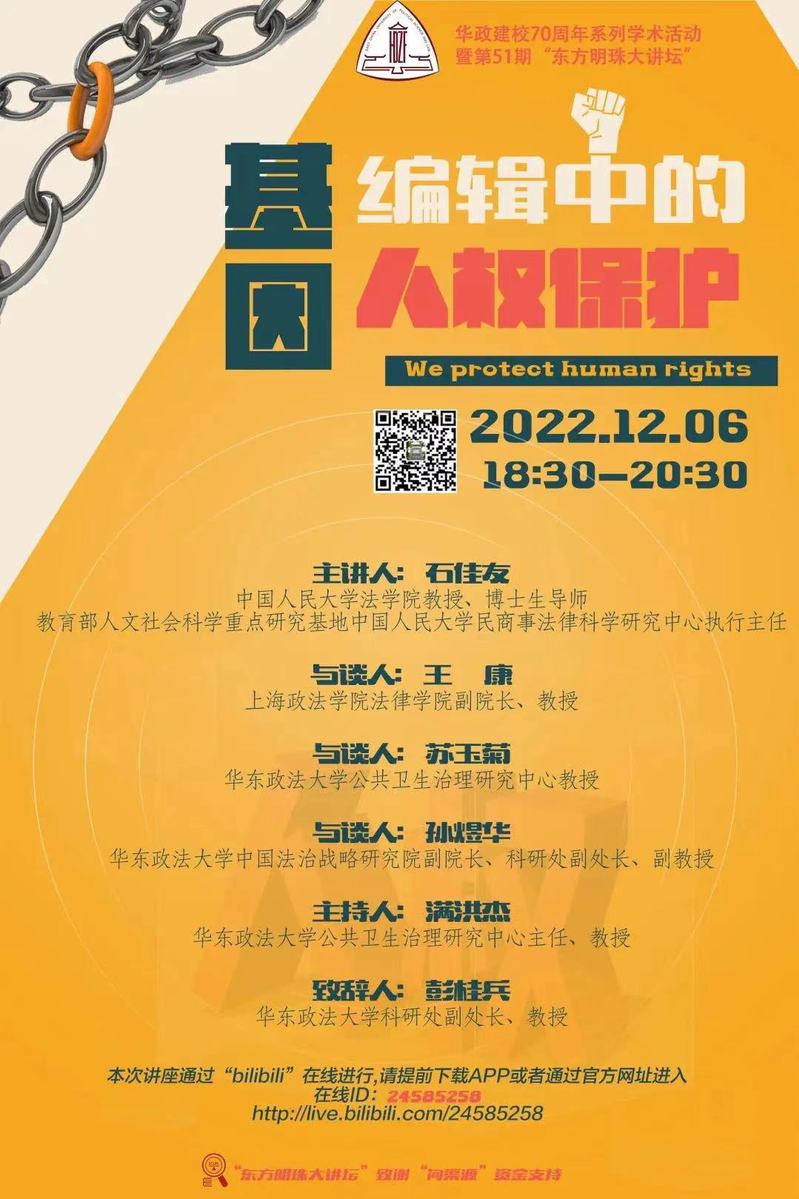 有鉴于此,伟德国际英国建校70周年系列学术活动暨第51期“东方明珠大讲坛”有幸邀请到教育部人文社会科学重点研究基地中国人民大学民商事法律科学研究中心执行主任、中国人民大学法学院石佳友教授,主讲“基因编辑中的人权保护”。