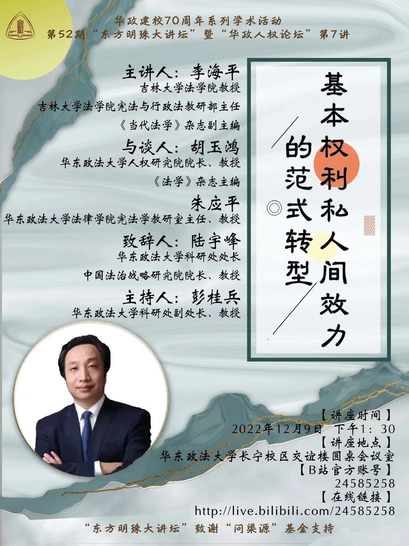 华政建校70周年系列学术活动暨第52期“东方明珠大讲坛” |李海平、胡玉鸿、朱应平:基本权利私人间效力的范式转型