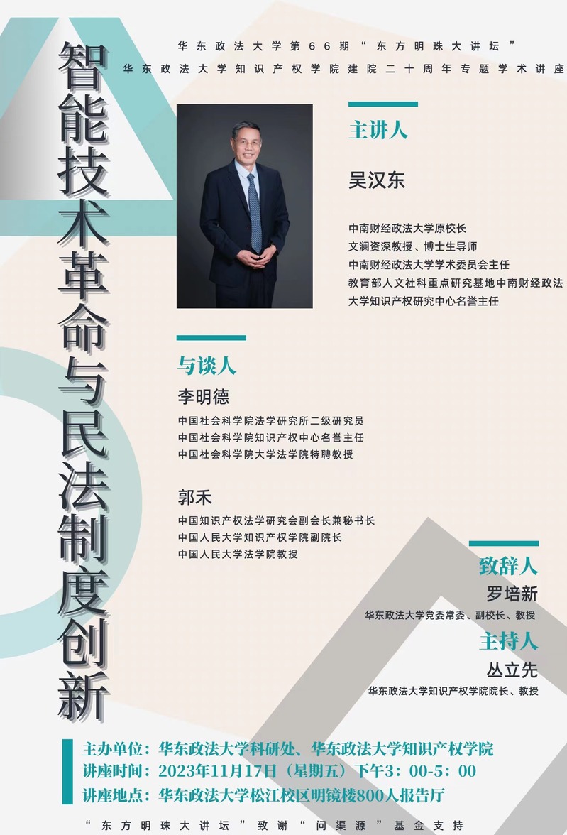 有鉴于此,伟德国际英国第66期“东方明珠大讲坛”有幸邀请到中南财经政法大学原校长、文澜资深教授、博士生导师、中南财经政法大学学术委员会主任、教育部人文社科重点研究基地中南财经政法大学知识产权研究中心名誉主任吴汉东教授主讲“智能技术革命与民法制度创新”。