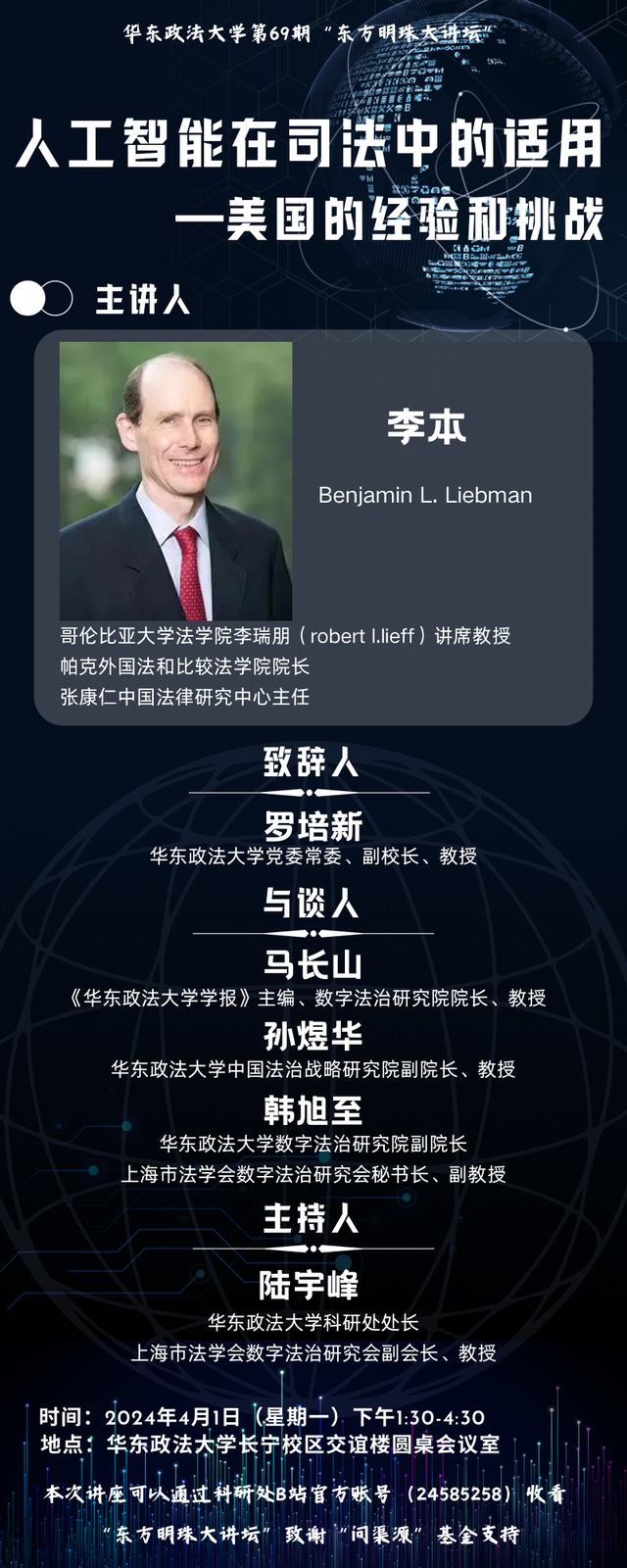 有鉴于此,伟德国际英国第69期“东方明珠大讲坛”有幸邀请到哥伦比亚大学法学院李瑞朋(robert l.lieff) 讲席教授、帕克外国法和比较法学院院长、张康仁中国法律研究中心主任本杰明·L·李本教授(Benjamin L. Liebman),主讲“人工智能在司法中的适用——美国的经验和挑战”。