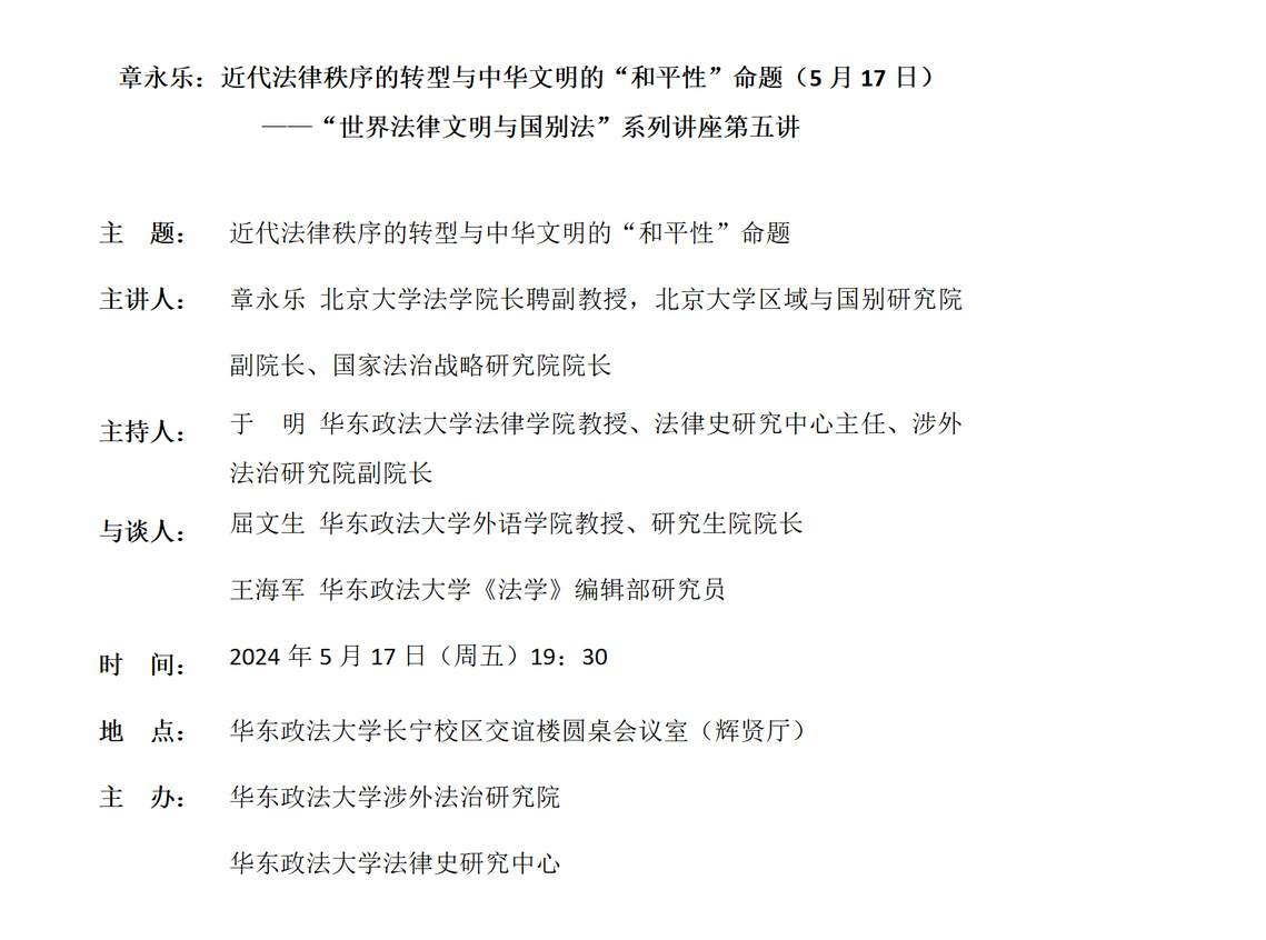 章永乐:近代法律秩序的转型与中华文明的“和平性”命题(5月17日) ——“世界法律文明与国别法”系列讲座第五讲