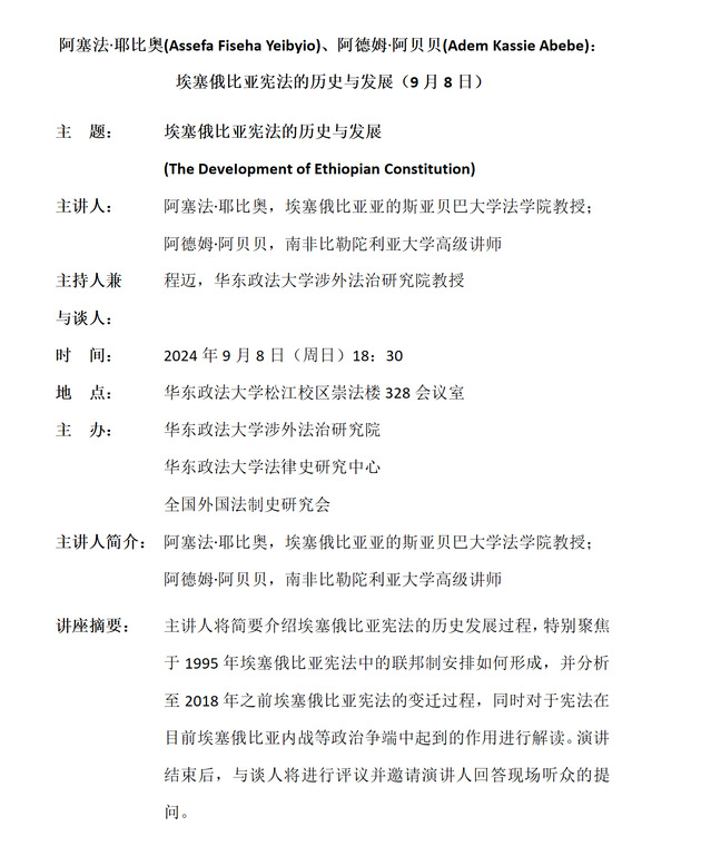 阿塞法·耶比奥(Assefa Fiseha Yeibyio)、阿德姆·阿贝贝(Adem Kassie Abebe): 埃塞俄比亚宪法的历史与发展(9月8日)