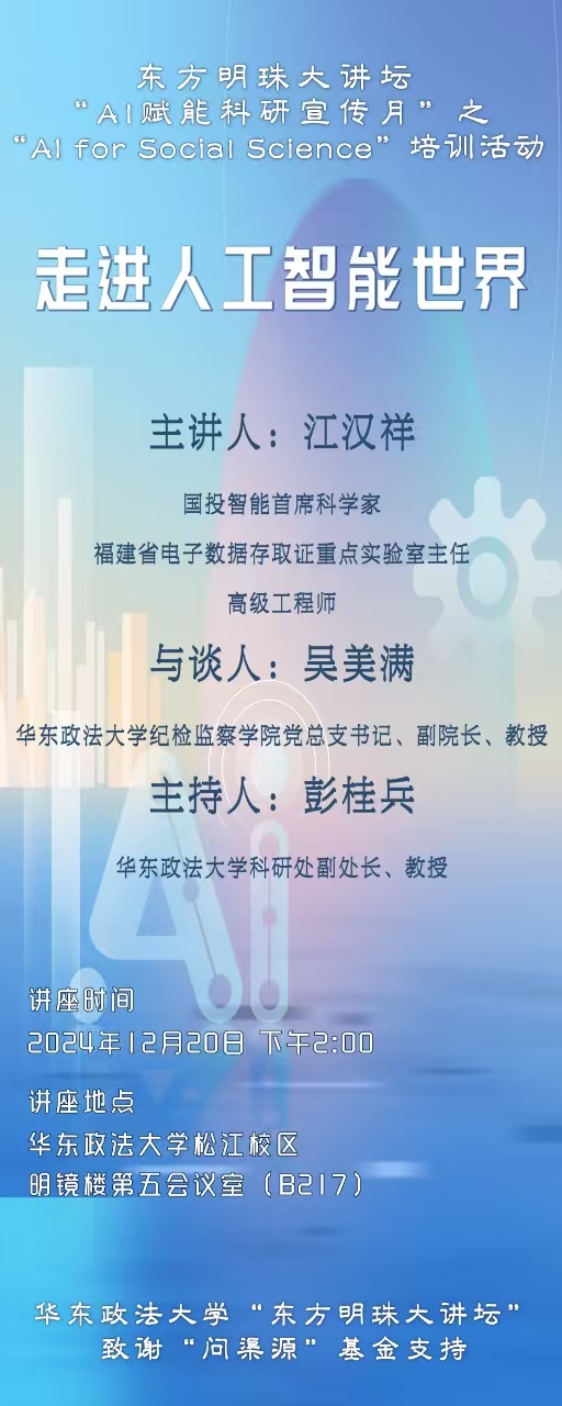 本期“东方明珠大讲坛”有幸邀请到国投智能首席科学家,福建省电子数据存取证重点实验室主任,高级工程师江汉祥先生主讲“走进人工智能世界”。江汉祥先生两次被聘为“公安部信息安全专家”,福建省“全省公安专家人才”、 厦门市引进重点产业和重点项目紧缺人才、厦门市“海纳百川”人才计划“金鹭英才”。主要研究电子数据取证、大数据侦查与分析、人工智能和网络空间犯罪防控治理体系研究。
