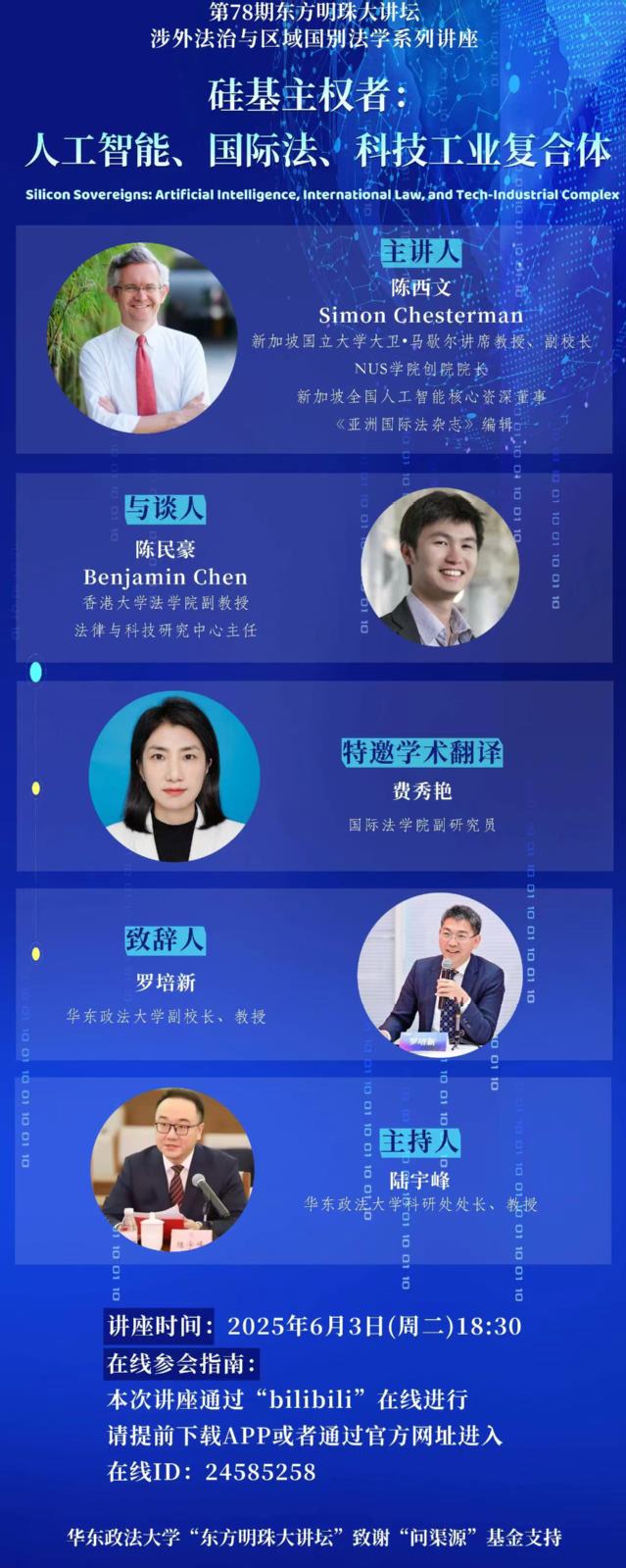主 讲 人:陈西文(Simon Chesterman) 新加坡国立大学大卫•马歇尔讲席教授、副校长,NUS 学院创院院长、新加坡全国人工智能核心资深董事、《亚洲国际法杂志》编辑