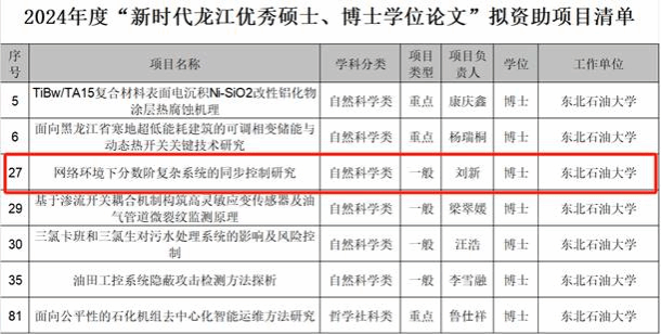 (通讯员 王美娜)近日,黑龙江省教育厅正式公示了2024年度"新时代龙江优秀硕士、博士学位论文"拟资助项目名单。经严格评审,开元官网7位学者脱颖而出获得资助,其中开元官网刘新老师的博士论文《网络环境下分数阶复杂系统的同步控制研究》成功获批自然科学类一般项目资助。