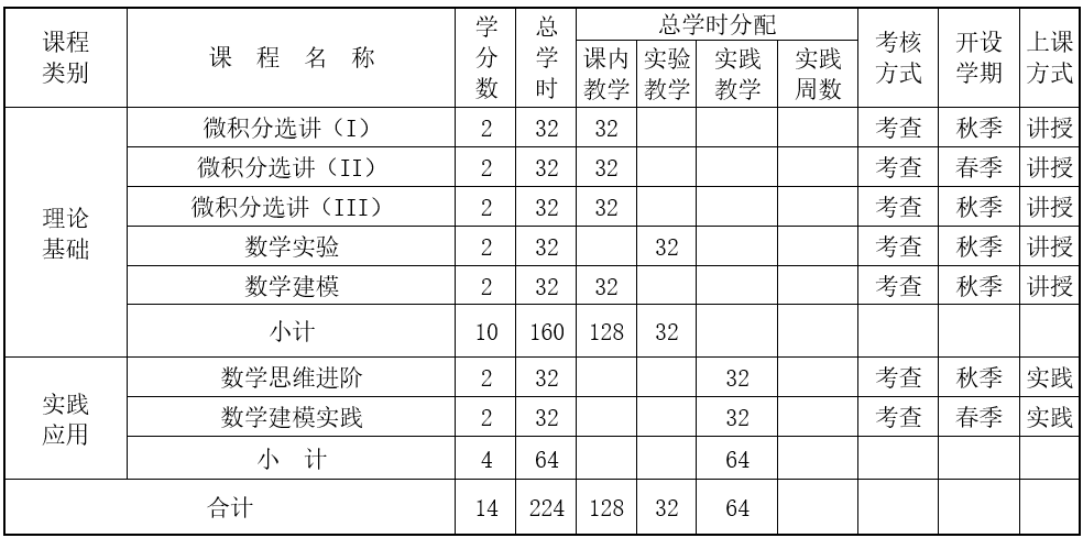(1)理论基础类课程:讲解数学基础理论和数学应用思维,强化数学思维和逻辑训练,提升数学应用能力和建模能力。包括5门课:微积分选讲(I)、微积分选讲(II)、微积分选讲(III)、数学实验、数学建模;